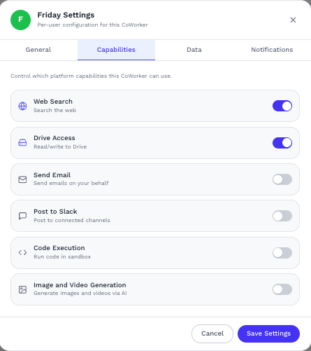 The Capabilities tab lets you decide which platform features Friday can use on your behalf. Enable web search, drive access, email, Slack, code execution, and media generation only when they support your needs, so your setup stays intentional, flexible, and aligned with the way you want Friday to work.