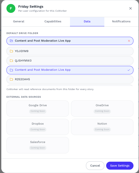 The Data tab lets you set a default drive folder so Friday can reference the right documents while working on stories, tasks, and research. It keeps file access more organized, makes source selection more intentional, and prepares the workspace for future integrations across external data platforms.