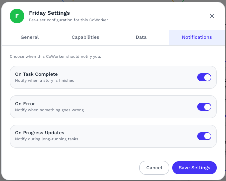 The Notifications tab helps you control when Friday reaches out during work. Enable alerts for task completion, errors, and progress updates so you stay informed at the right moments without adding unnecessary noise. It makes communication clearer, more intentional, and better aligned with how you want to monitor work.